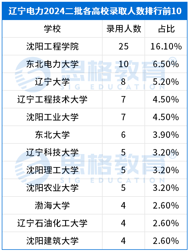 从录取高校来看,辽宁电力录取排名靠前的高校同样以辽宁本地院校为主。其中,沈阳工程学院作为原电力部直属院校,在提前批和网申方面有极大的优势,加上又是辽宁本地院校,所以沈阳工程学院的考生在辽宁电力一批录取排名中总是排在首位。