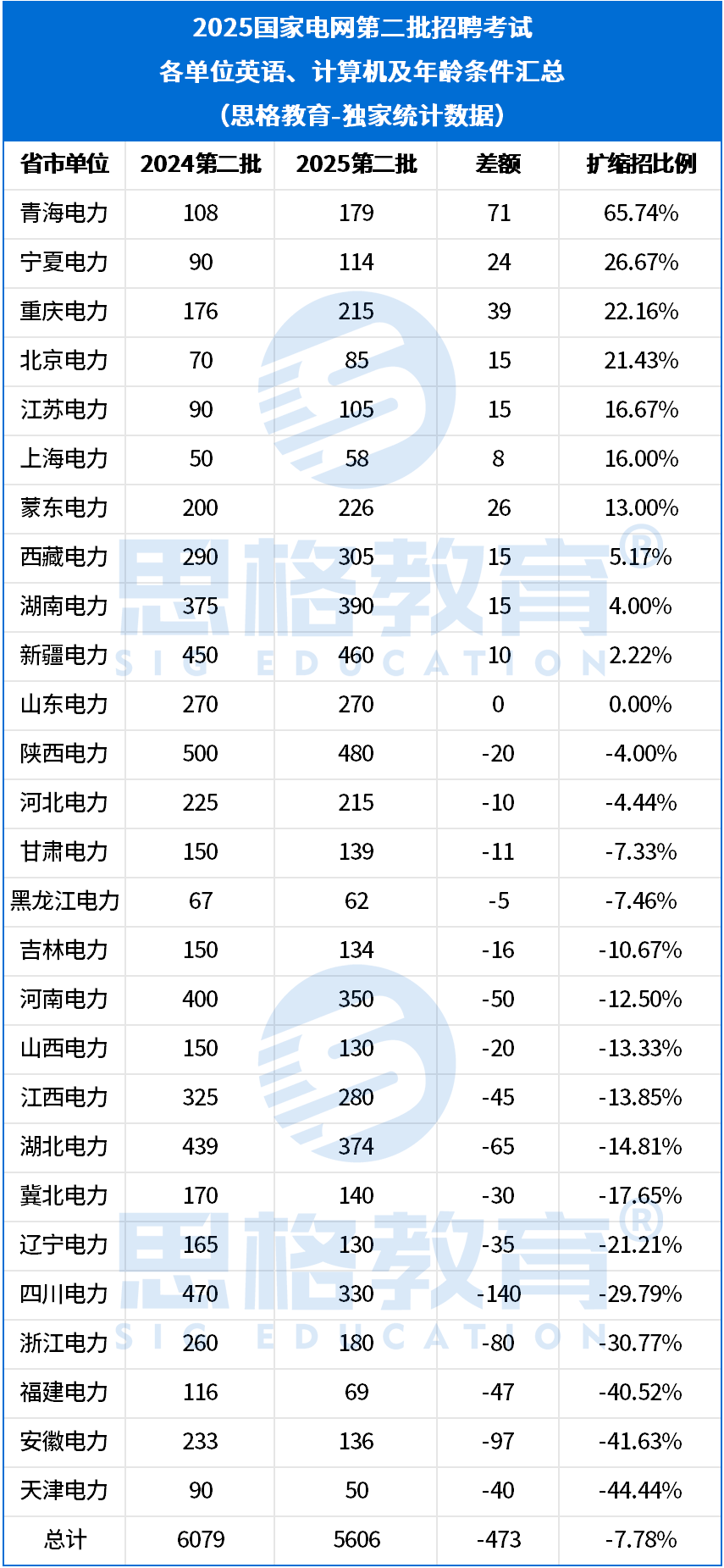 本批次电网省市单位招聘共5606人,较比去年同批次缩招473人,下降7.78% 。今年国家电网二批招聘的整体趋势呈现缩招情况,其中天津电力缩招了40%以上。
