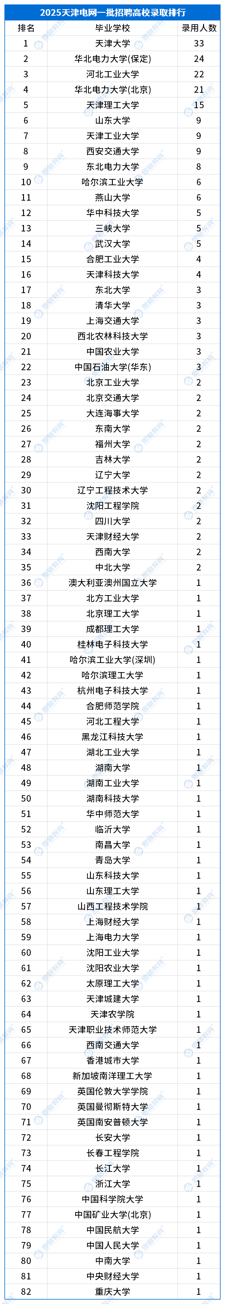 今天小思给大家带来的是天津电力全三批招聘考试各高校录用人数排行榜~