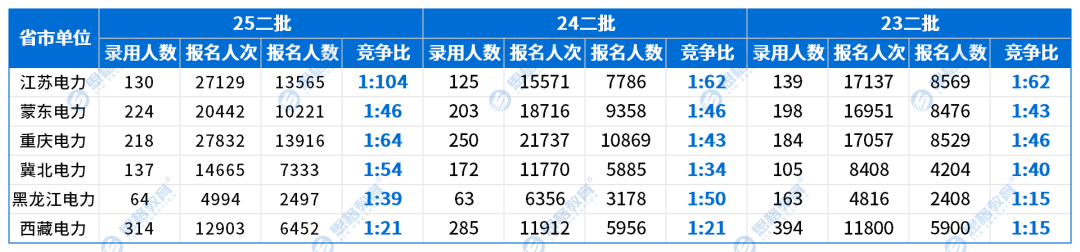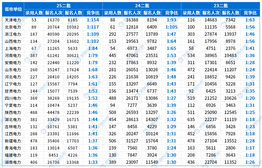 近两年毕业生人数不断增多,同学们的职业选择也更倾向于稳定化,于是报名人数增多。以上海电力为例,2023年-2025年一批招聘中,招录人数变化不大的情况下,报名人数从2376增加至5633,导致竞争越来越激烈。