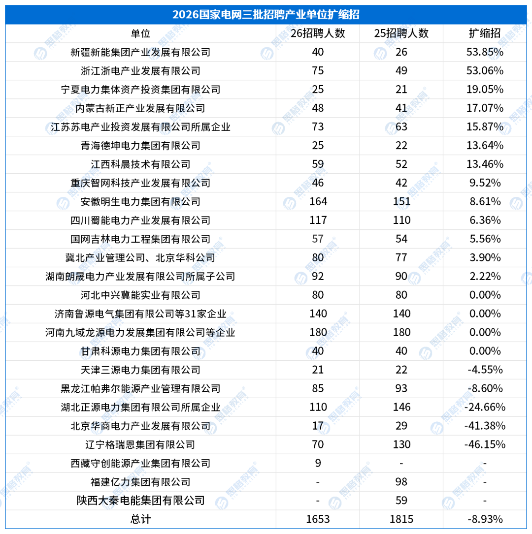 三批产业单位整体缩招9.93%,其中扩招最多的为新疆新能集团产业发展有限公司,扩招53.85%,缩招最多的单位为北京华商电力产业发展有限公司,缩招46.15%。